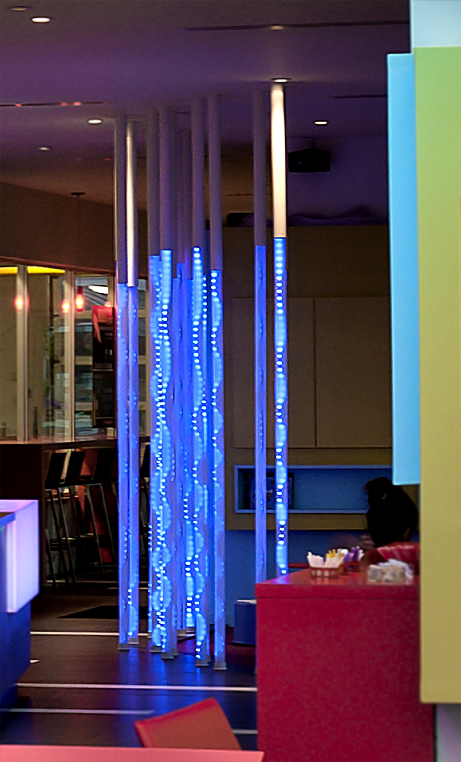 Loosle continued, “We reconfigured the interior and completely opened up the entire space. We chose ACRYLITE® acrylic for decorations and unique LED lighting installations throughout. I’m particularly impressed with how well ACRYLITE® Satinice worked for the undulating ceiling panels inside. You can even see their light show from the street.”