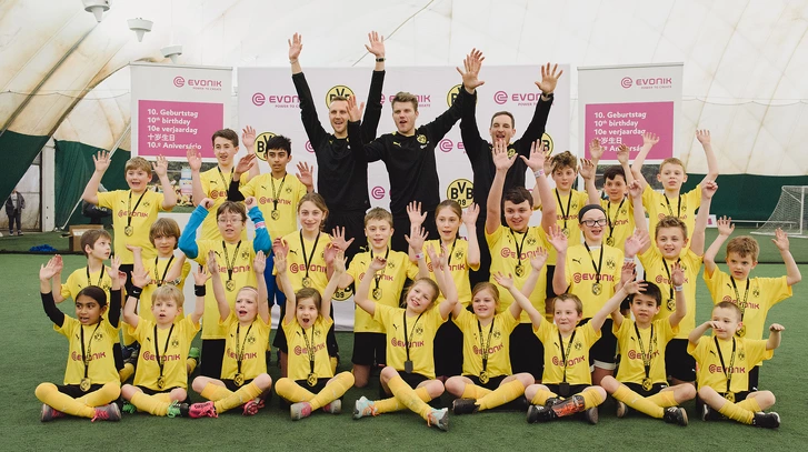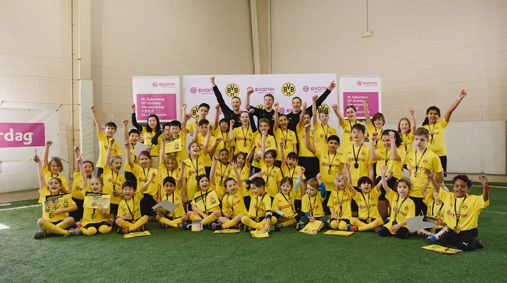 The children of Evonik employees had the chance to blow out the final candle on Evonik’s tenth birthday cake, along with new friends from the BVB Evonik Soccer School.